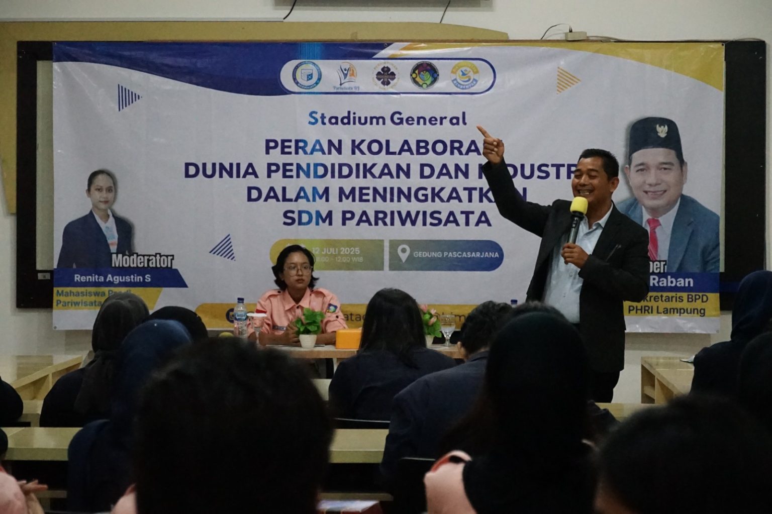 (TK)BandarLampung— Himpunan Mahasiswa Pariwisata (Hima Pariwisata) Institut Informatika dan Bisnis (IIB) Darmajaya menggelar Stadium General bertajuk “Peran Kolaborasi Dunia Pendidikan dan Industri dalam Meningkatkan SDM Pariwisata”, pada Kamis (12/6/25), di Gedung Pascasarjana Kampus The Best.